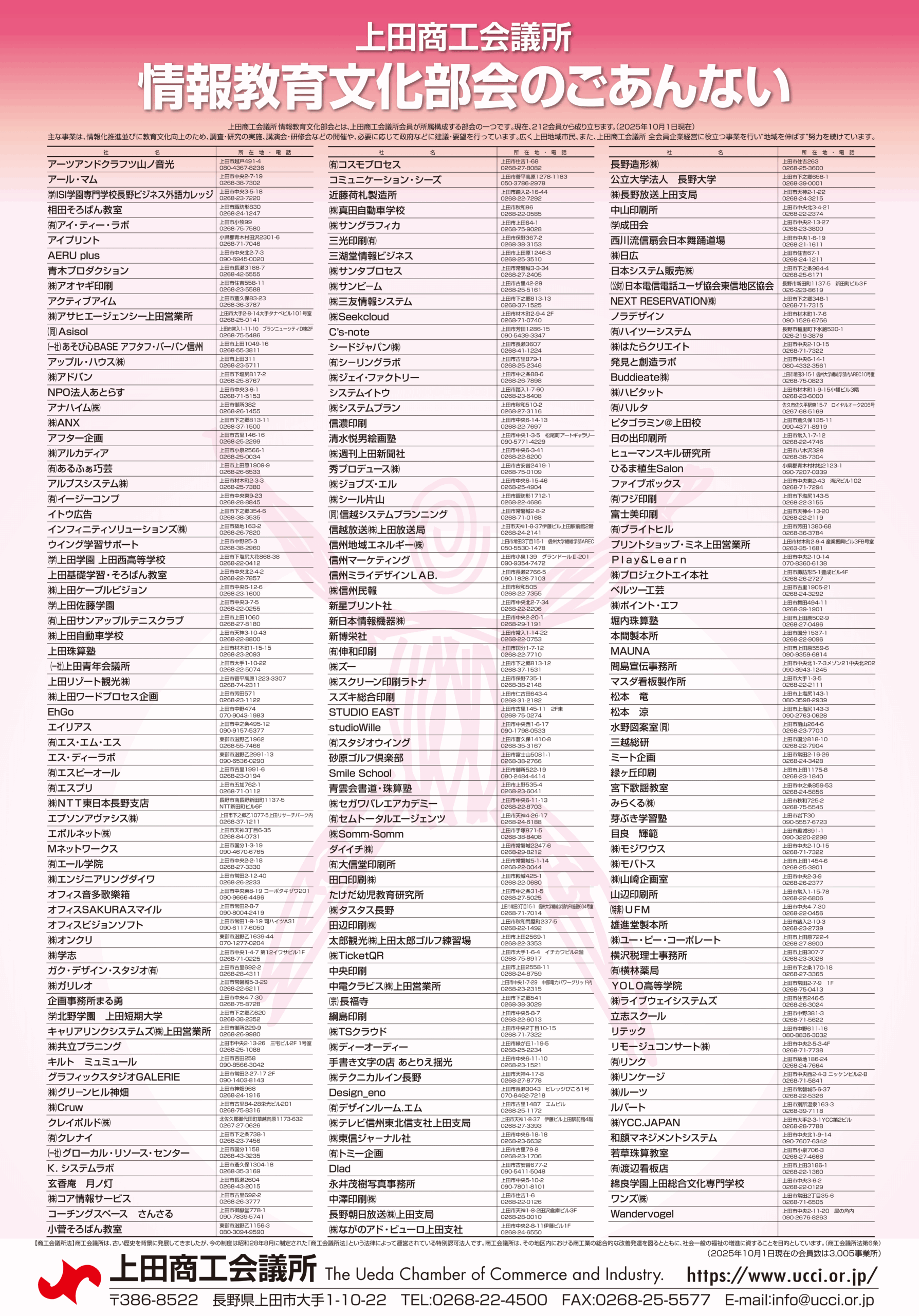 上田商工会議所会員の、新聞・出版・印刷業、放送業、通信・情報サービス業、ソフトウェア開発、広告業、映画・娯楽、学校などの事業所で構成される部会で、212の事業所からなります。(2025年10月1日現在)