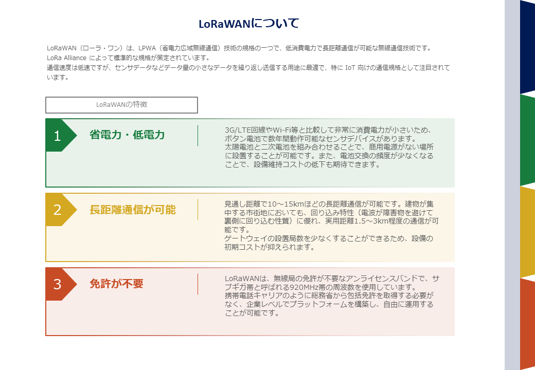 LPWAとは、“Low Power Wide Area”の頭文字を取った名称であり、“省電力・長距離通信”コンセプトとした通信技術です。