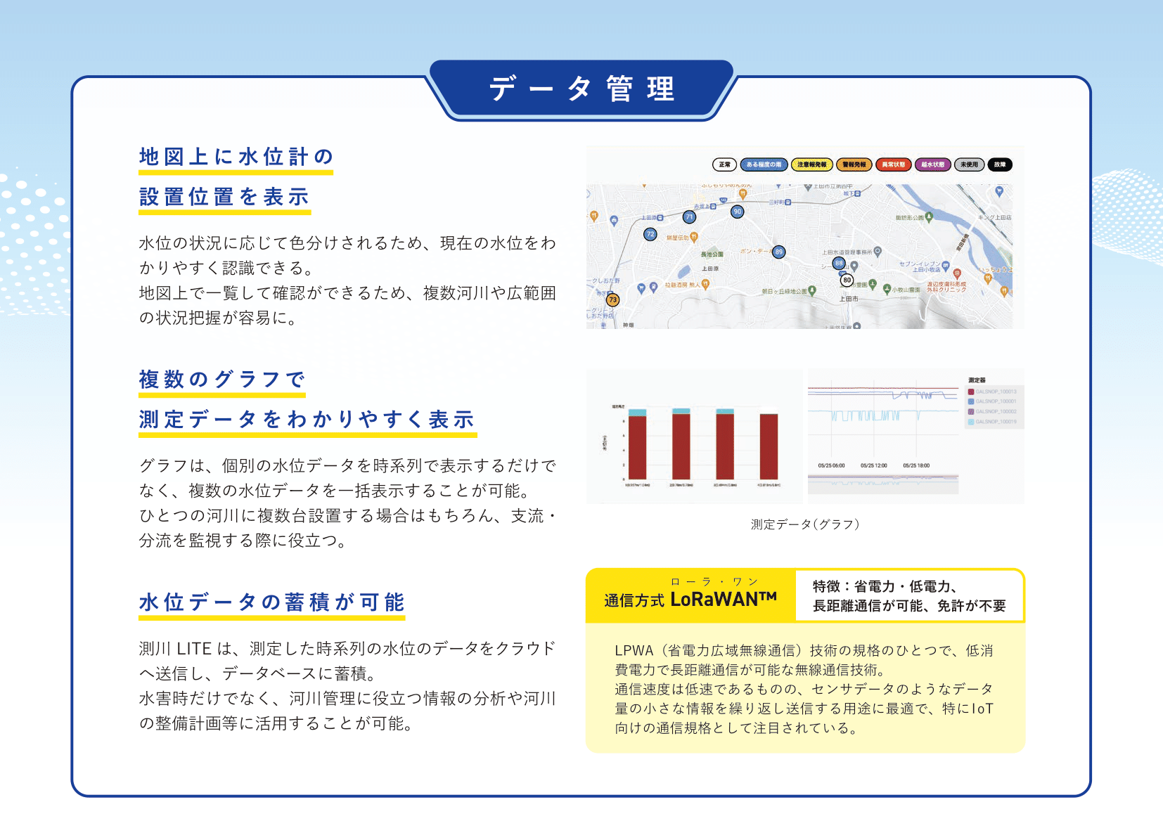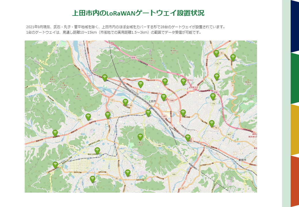 LPWAの通信速度は数kbpsから数百kbps程度と携帯電話システムと比較して低速なものの、一般的な電池で数年から数十年にわたって運用可能な省電力性や、数kmから数十kmもの通信が可能な広域性を有しています。既にフランスなどではSigfox社により全土にLPWAのネットワークが構築され、米国などでもLoRa規格によるLPWAの導入が始まっています。その中でも、上田市の事業ではLoRaWAN(ローラ・ワン)という通信規格を用いています。