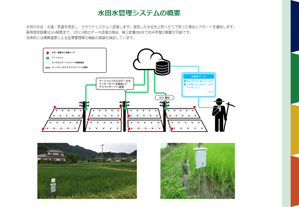 LPWAによる地域の農林業のスマート化に向けた取り組みを紹介します。鳥獣害防止・水田水管理などで実際に使われている機器を展示します。